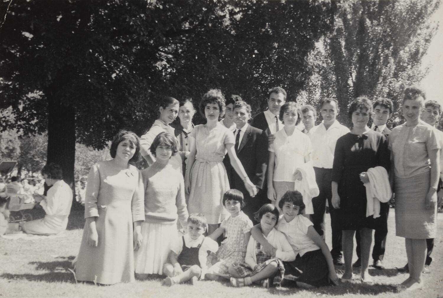 Digital photograph of Efstathia Spiropoulos with family and friends during the Moomba Festival, taken near the Shrine of Remembrance, Melbourne, 1965. Efstathia is standing back row left, her daughter Stavroula is front row seated with her sister Athena's arm around her.