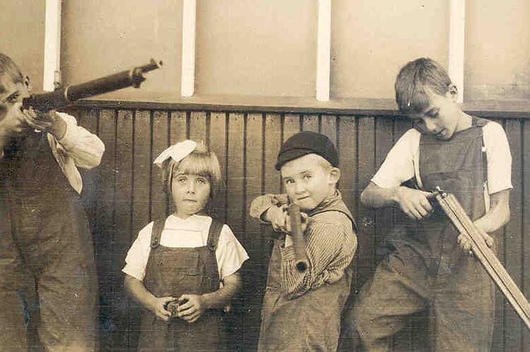 Digital photograph of Alison Kelly at age 4 years old with her three brothers probably outside their family home in Morwell, 1928. It was taken around the time Alison was given a small Chinese doll by a man of Chinese descent in the late 1920s. The boys are all pointing or loading rifles. People in the photo, left to right: Desmond Percy Kelly, Alison Mary Kelly, Frank Donald Kelly and Brian Patrick Kelly. Their father Perce Kelly was a member of the Morwell Gun Club and occasionally shot rabbits and ducks. He wanted his sons to be calm and sensible with their guns and to know how to handle them. Their mother Elsie however, did not like guns and Alison was not encouraged to participate.