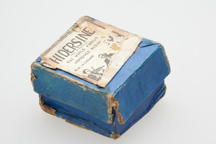Container for Hidersine Resin, used by Angelo Candela, an Italian migrant. Angelo migrated to Australia, at the age of ten, in November 1920 with his father Vincenzo and stepmother Emanuela. Angelo was introduced to music in his hometown of Viggiano from a young age, in Australia he continued to take music lessons from Di Giglio, Briglia and Curcio, specialising in violin. In Melbourne, Angelo began playing in public as early as 1925, when he worked with one of the Lamacchia brothers. He also performed with other Italian musicians, such as Ginnacini and Giovanni Cera, for a number of years. With them Candela established the Argentino Tango Band which successfully performed on radio, as well in the Myer Dining Hall. At the outbreak of World War II, Angelo enlisted in the Australian Army and joined the 3rd Australian Division Concert Party, and travelled around Australia performing with the band. In 1951 Angelo returned to ABC Radio and worked for them for 25 years until retirement.