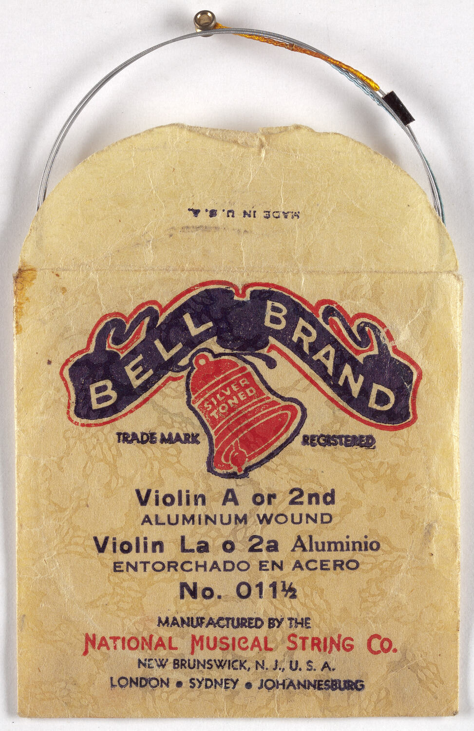 On front: BELL BRAND/TRADE MARK REGESTERIED/Violin A or 2nd/ALUMINUM WOUND/Violin La o 2a Aluminio/ENTORCHADO EN ACERO/No. 011 1/2 / MANUFACTURED BY THE/ NATIONAL MUSICAL STRING CO./NEW BRUNSWICK, N.J. U.S.A/LONDON.SYDNEY.JOHANNESBURG