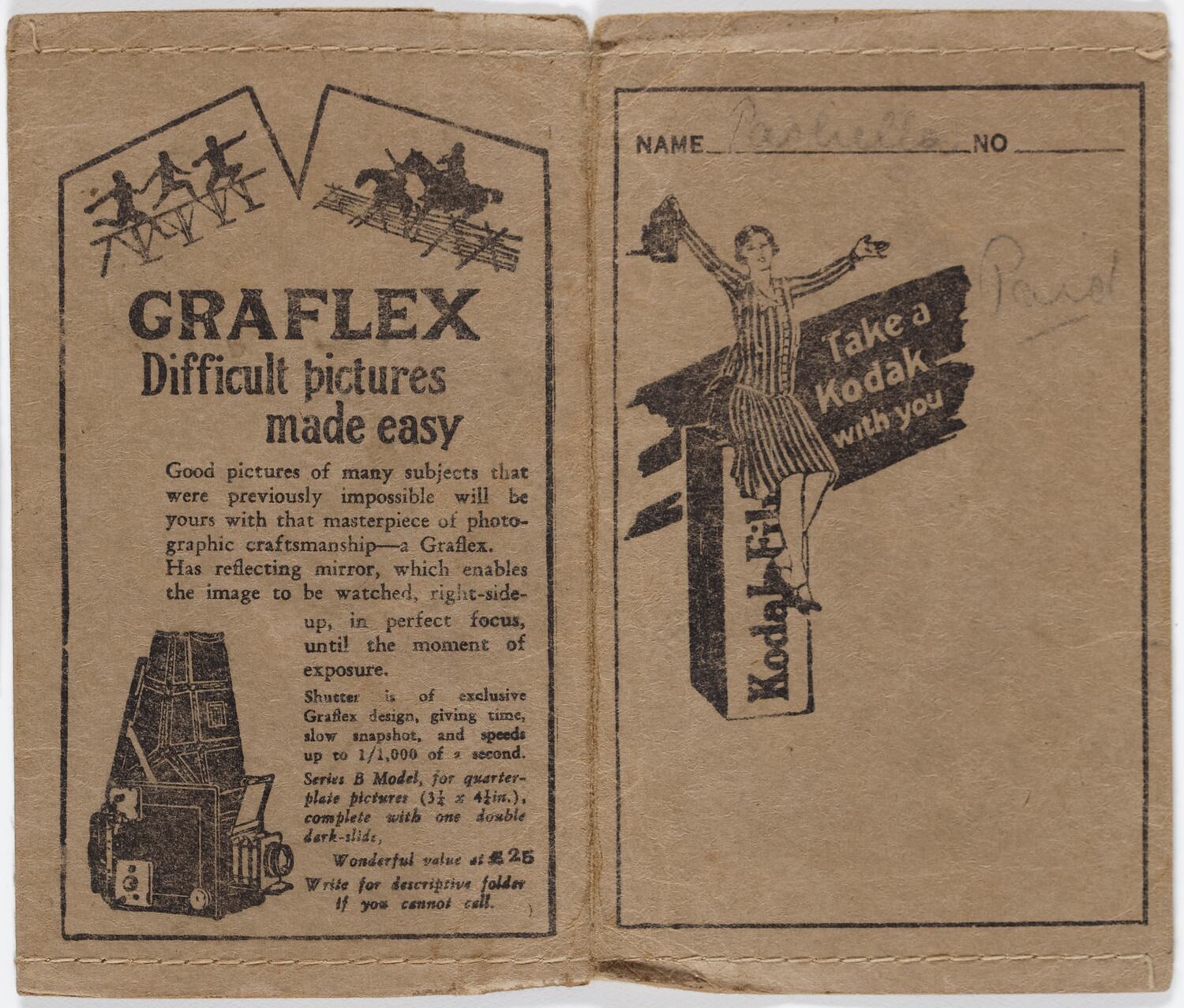 On front:Name (printed in black) Pasliella (hand written in greylead) No (printed in black)/Take a /Kodak/ with You (printed in black)/ Paid (printed in greylead) Inside: Extensive text On back: GRAFLEX/Difficult pictures/made easy/extensive text
