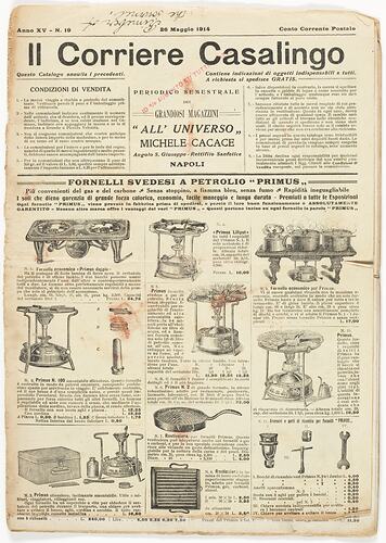 Catalogue for Il Corriere Casalingo, 26 May 1914. It was used by the Candela family, in Viggiaro, Italy before they migrated to Australia in 1920. The Candelas made much of their own food including homemade pasta, tomato sauce, wine, sausages and they roasted their own coffee. Items were often ordered by mail from the Italian manufacturer, this was a practice common in both Italy and Australia. Vincenzo continued to receive catalogues like these from Italy after his migration to Australia in 1920.