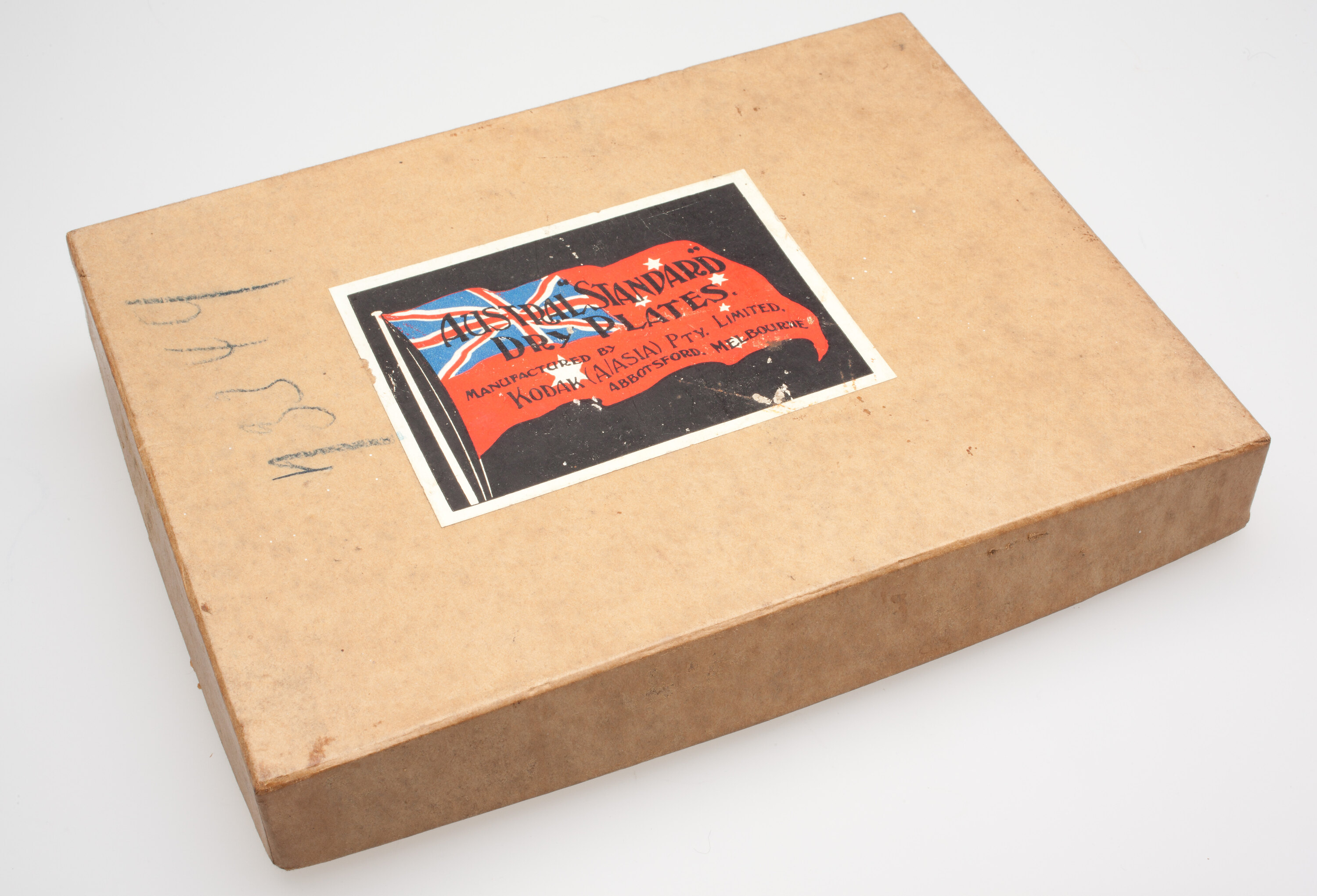 Box for Austral 'Standard Dry Plates', 'Half plate', manufactured by Kodak (Australasia) Pty Ltd. Used by Vincenzo Candela after his migration to Australia. Vincenzo had been a professional photographer in Viggiano, Italy, where he specialised in portraiture, landscape and village life. After his migration to Australia he continued to use his photographic equipment, more as a hobby than a trade, taking photos of family members and friends in his home, with impromptu backdrops such as a rug or a sheet.