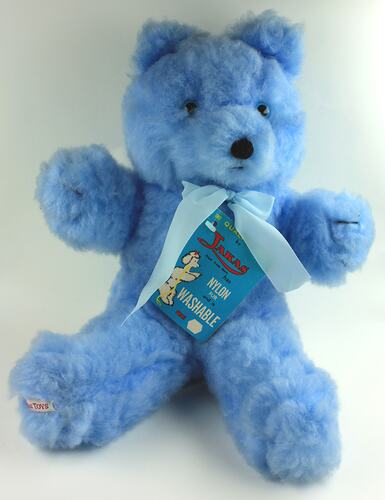 A plush light blue coloured teddy bear with two-toned black and blue coloured plastic eyes, black embroidered nose and mouth and one black 'claw' stitched onto its upper paws. It is made in the seated position with arms outstretched. There is a light blue ribbon tied into a bow around its neck and a white fabric label stitched underneath one of its lower limbs with 'Jakas Toys' embroidered in red. There is a small 48-page booklet attached to the body of the teddy bear with a plastic joiner which has colour images of the range of toy designs available, text describing the features of the toy and instructions for care and washing.
