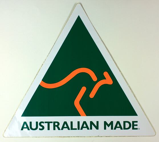 Triangular sticker of the distinct green and gold kangaroo logo which became a recognised marketing symbol indicating goods made in Australia.