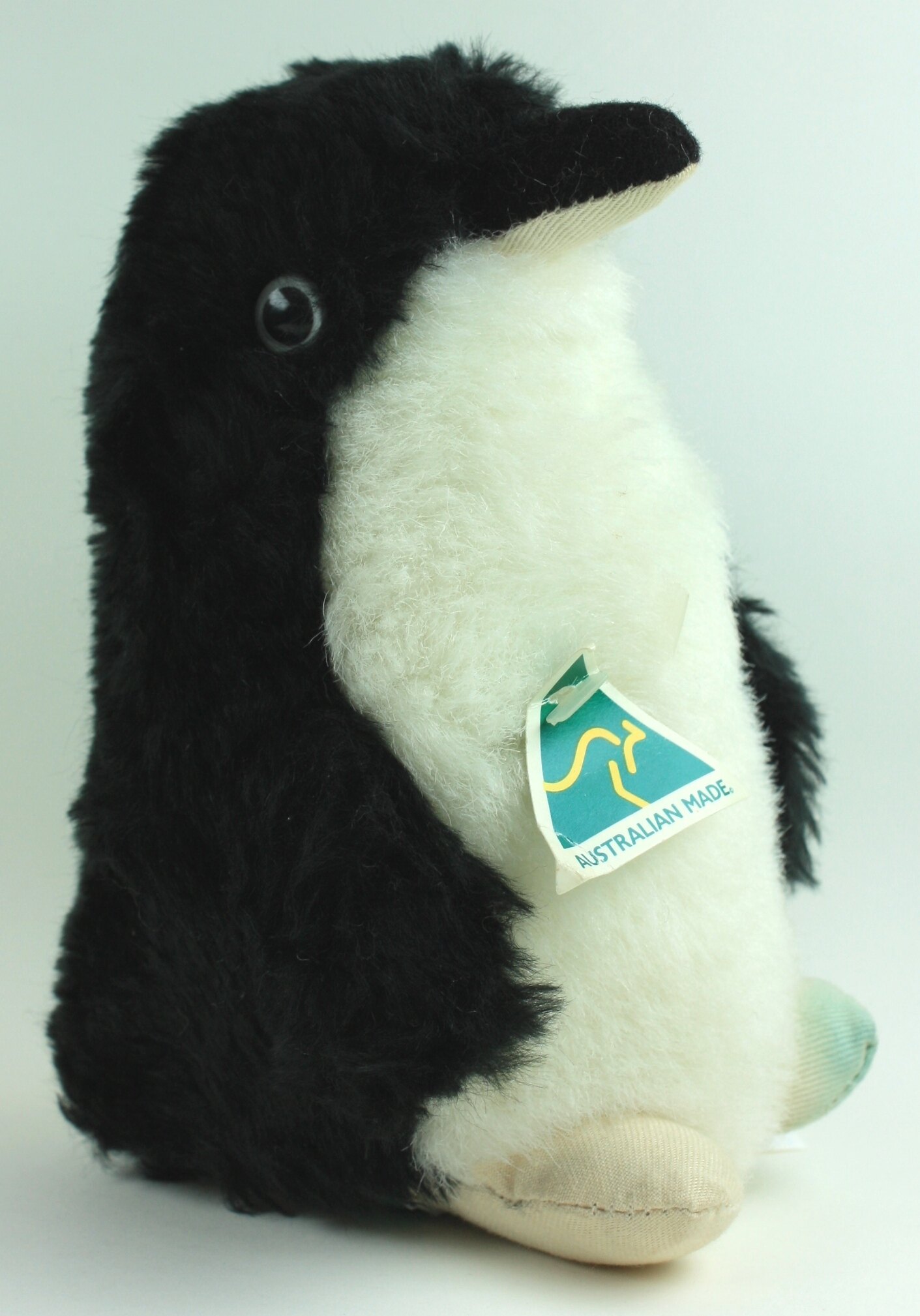 Toy penguin with black plush material extending from the top of the head and down the back and white plush material covering the front section. The underside is made of stitched cream coloured material with two extensions jutting out as feet. There is a faint green stain on its left 'foot'. It has two toned black and white coloured plastic eyes with a firm stitched protruding beak consisting of black plush material on the upper side and a cream coloured cotton material on the underside. There are two flaps of stitched material on either side of the body as wings consisting of black plush material on the upper part and a cream coloured cotton material on the underside. A triangular label with the 'Australian Made' logo is secured to the body of toy penguin with a plastic joiner, and a white fabric label is stitched onto the underside with the Jakas Soft Toys brand name and 'Australian Made' logo embroidered in green.