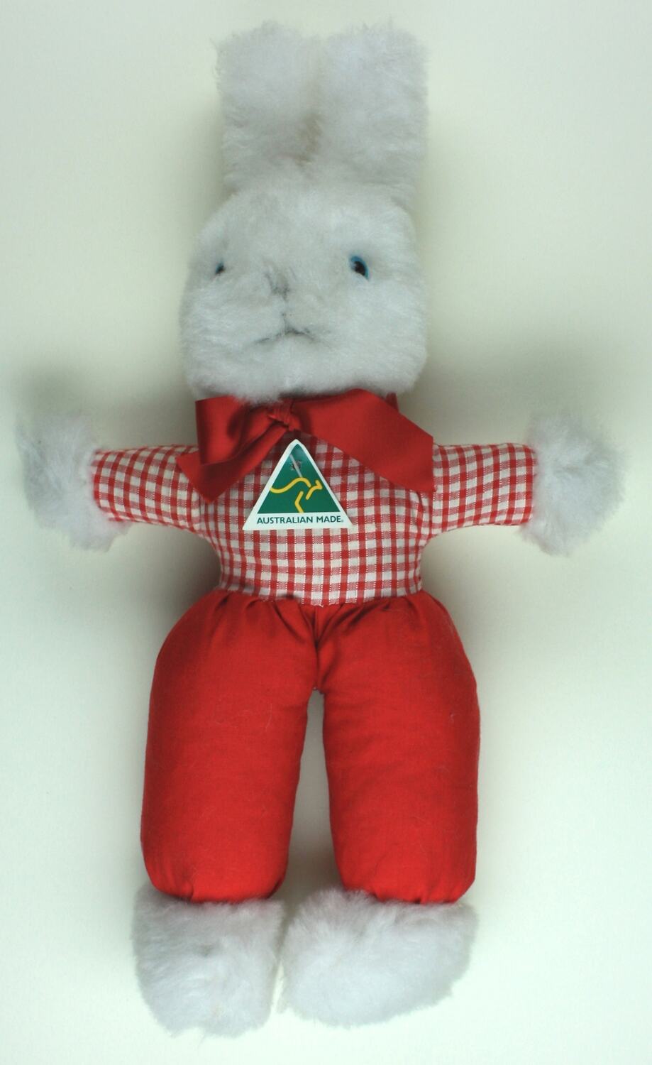A white plush toy rabbit with two toned black/blue coloured plastic eyes and simple black stitching creating a nose and mouth. It is dressed in a red and white checked gingham top and red pants with a red satin ribbon tied into a bow around its neck. A small triangular label with the 'Australian Made' logo is secured to the front of the body with a plastic joiner. There is a cream coloured label sewn onto the back of the lower left limb with 'JAKAS TOYS AUSTRALIAN MADE' printed in red.