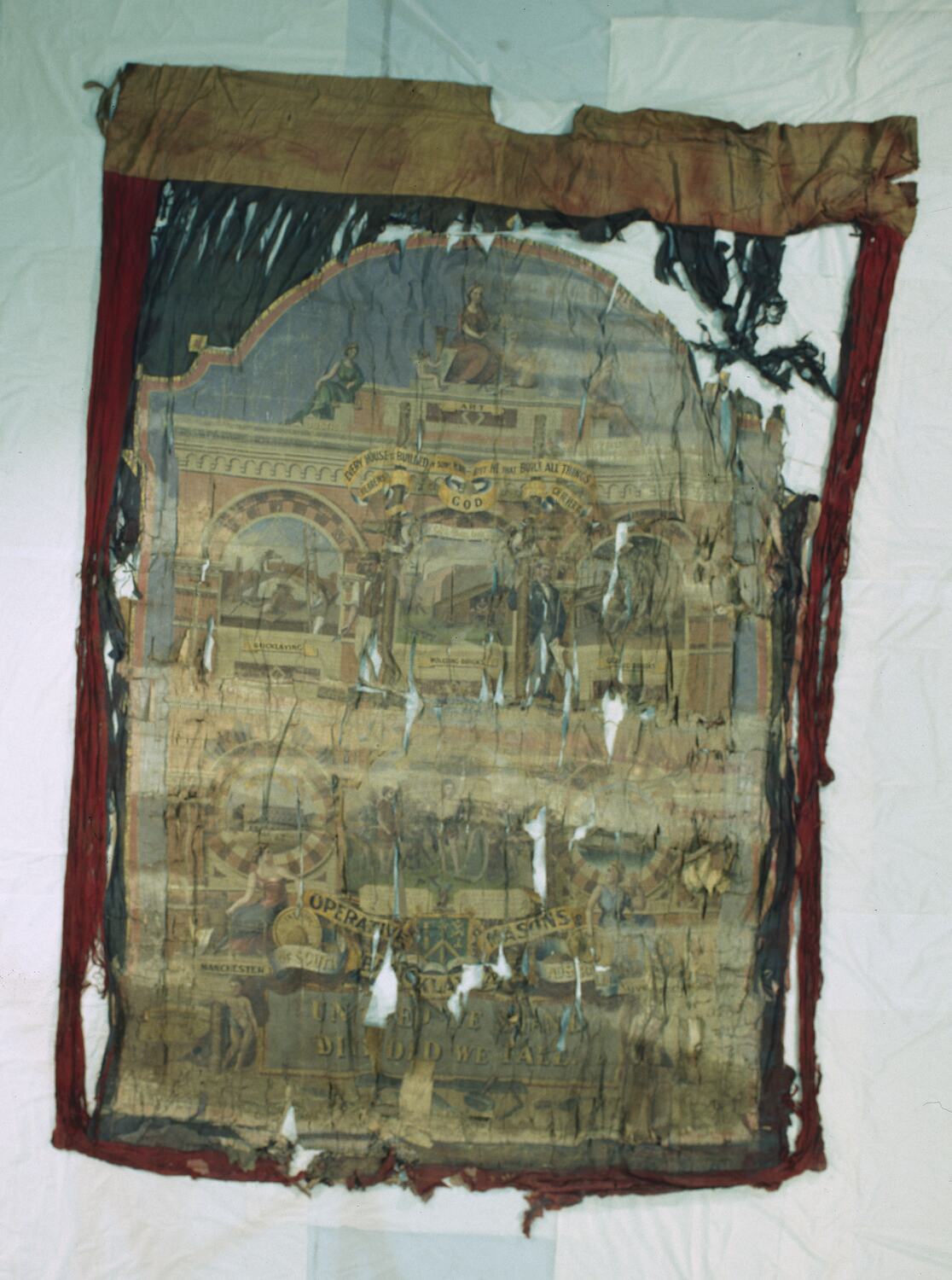 Large painted banner in extremely poor condition. Blue dyed silk faille constructed with 7 horizontal fabric lengths, machine sewn French seams. Red trim. Recto: Large architectural style design set in an ethereal sky scape with allegorical figures surmounting and within architectural forms. Framed detailed tableaus on two levels describe ideology, skills and attributes of the union. Large tablet centre bottom holds lettering. Signed and date lower right hand corner.Verso: undecorated.