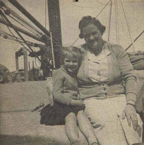 Digital photograph of Rosemary Norman aged six years with Nellie McKay her nursemaid, 1939. They are travelling on an Orient Line ship from Melbourne to London with Rosemary's parents, her father Reginald Havill Norman in his role as manager of the Orient Line Melbourne Branch.