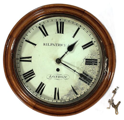 Large, round wall clock. Wood case with hinged glass door with metal rim. Face is white with black roman numeral hours, minute marks and black hands. 15cm x 8cm hinged wooden door on either side of casing to allow access to inner workings; 10cm x 8cm locked door underneath clock to allow access to swing pendulum if clock stops. Clock is key-wound. Winding key is brass. Two wooden pegs behind left side of clock; one wooden peg behind right side of clock, possibly to remove whole face of clock.