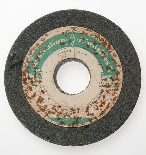 Grinding wheel manufactured by Australian Abrasives circa 1970-1990. It was found in a cabinet in Area E4 in Adolph Bruhn & Son's Wood Turners Shop, 283 Coventry Street, South Melbourne. The business was established by Adolph Bruhn circa 1893 in Little Collins Street, Melbourne. Upon his death in 1919 it was then operated by Adolph's son Sophus Christopher Bruhn. Upon Sophus's death in 1959 his son Sophus Walter Bruhn took over the business. In 1970 Sophus reduced the scale of the business and relocated to South Melbourne. The business closed upon Sophus's death in January 1990.