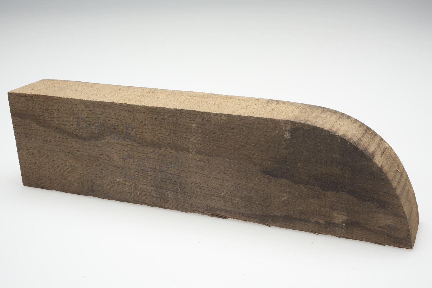 Piece of American Oak. It is in a commercially sawn length with one end curved. The timber is raw and its name has been written on it in pencil by the artist.