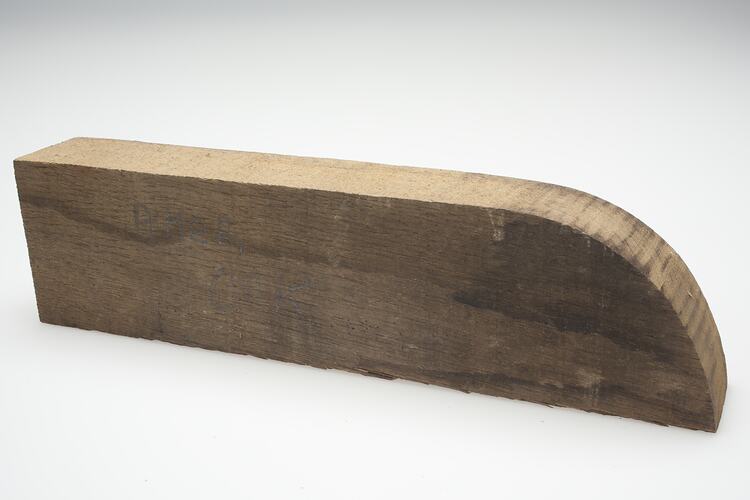 Piece of uncarved American Oak, which was part of the stock that Eva Schubert had for carving in her studio in Nunawading. She wrote the name of the timber on the piece when she donated it to the Museum. Although Eva often selects timber for specific projects sometime the timber will suggest the project to her. The different qualities of each type of timber are utilised in different projects.