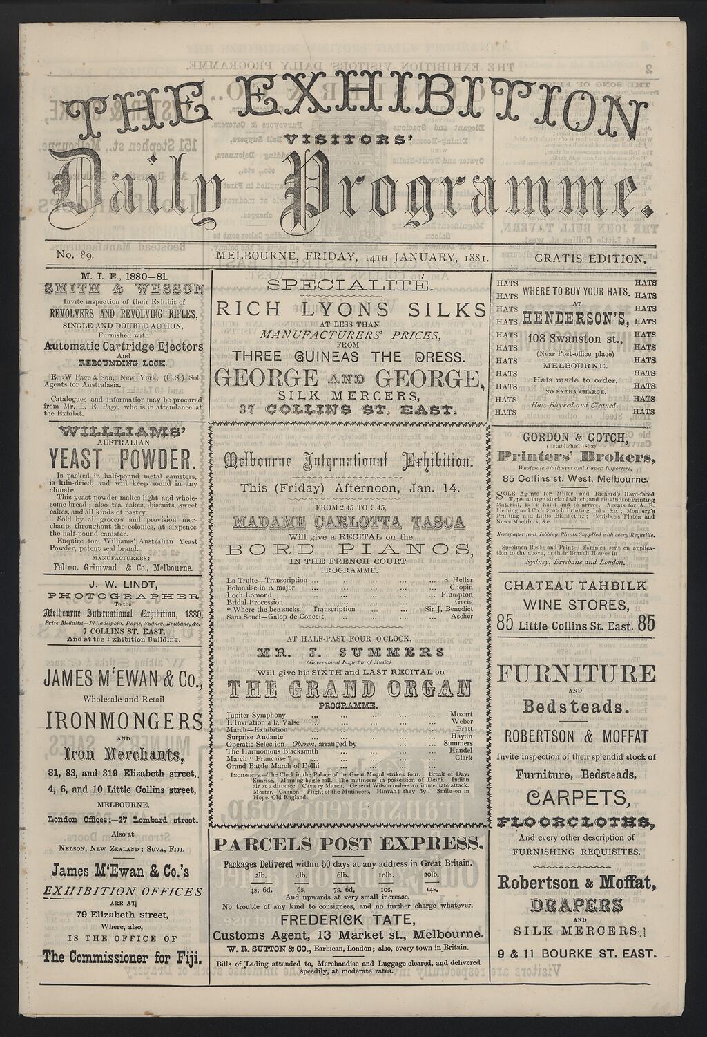 Printed, front: THE EXHIBITION/VISITORS'/Daily Programme./No.89 MELBOURNE, FRIDAY, 14TH JANUARY, 1881. GRATIS EDITION. [extensive text throughout].