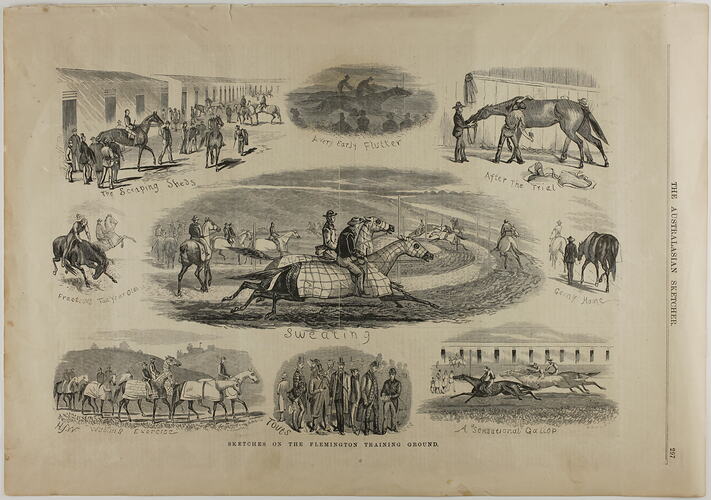 Captions for each illustration: The Scraping Sheds; A Very Early Flutter; After The Trial; Fractious Two Year Old; Sweating; Going Home; HJW Walking Exercise; Touts; A Sensational Gallop; SKETCHES ON THE FLEMINGTON TRAINING GROUND.; THE AUSTRALASIAN SKETCHER. 207