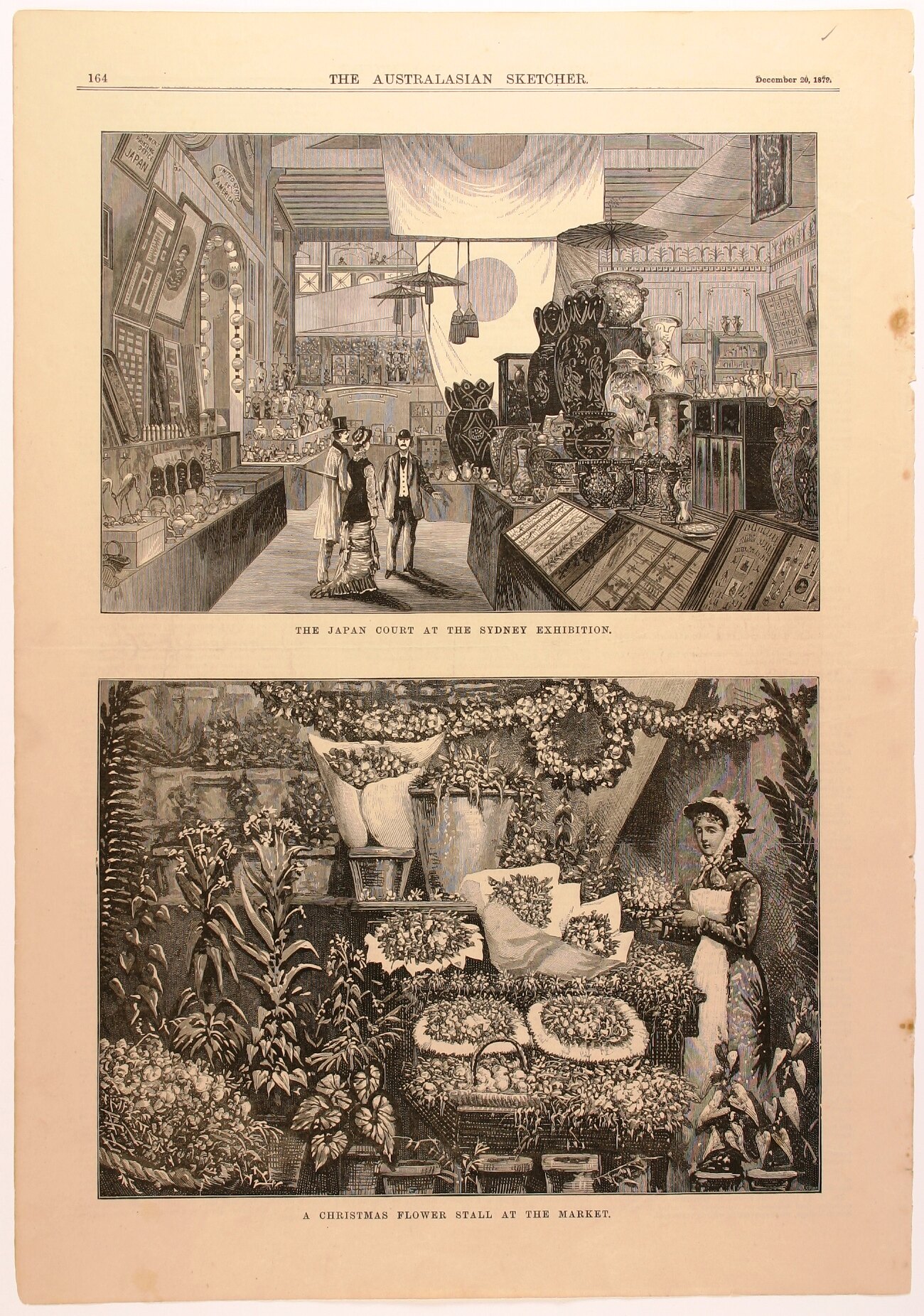 Page 164 consists of two half page black & white illustrations taken from a woodblock engravings, the upper image depicting the Japan Court at the Sydney International Exhibition, 1879, and the lower image depicting a christmas flower stall at the market. In the illustration of the Japan Court, a Japanese attendant in contemporary western costume is showing a formally dressed man and woman through the Court. Objects depicted include traditionally decorated ceramics, chinaware, and objets d'art. Japanese flags, lanterns and paper parasols hang from the ceiling. Page 163 contains three columns of newspaper text, not related to the illustration.