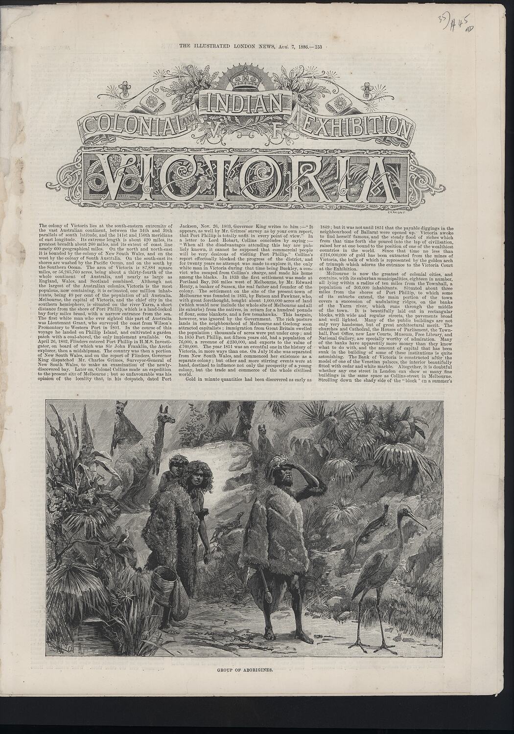 Newspaper extract of The Illustrated London News, Saturday, 7 August 1886, pp.153-160. Page 153 is the front page of the section on the Victorian Court at the Colonial and Indian Exhibition, 1886, and has a highly decorative masthead, the exhibition title of 'COLONIAL AND INDIAN EXHIBITION' is framed in an unfurling banner with oak leave and foliate ornamentation, while the court title, 'VICTORIA' is decorated with wheat sheaves, bunches of grapes and cornucopia. An imperial crown sits above the exhibition title, with the initials 'V' and 'R' (Victoria Regina) below. At the bottom of page 153 is an illustration titled 'GROUP OF ABORIGINES.' An Aboriginal man, accompanied by a woman carrying a child on her back, are depicted walking through the bush, dressed in animal skins with the woman is carrying a basket and bag. Kangaroos, goannas and birds are also depicted. Pages 156-57 comprise text and illustrations also about the Exhibition and concentrating on Victorian contributions. Illustrations include one of an Aboriginal encampment, showing a mia-mia. Two show the gold trophy, one shows Australian fruit produce and one shows the produce of Chateau Tahbilk winery. The accompanying text describes the Victorian court.