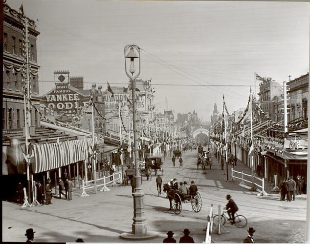 Photograph of Bourke Street in Melbourne taken in May 1901 as the city was being dressed for the visit of the Duke & Duchess of Cornwall and York for the opening of the first federal parliament of Australia, which took place in the (Royal) Exhibition Building on 9 May. For the 10 days of the royal couple's visit, city streets were bedecked with bunting and arches. The photographer was M J Daniel.