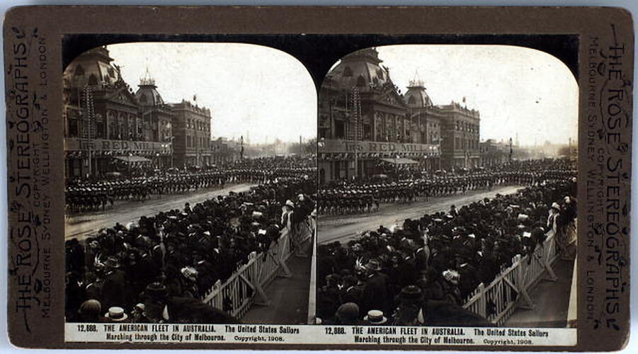 Text: 12888 THE AMERICAN FLEET IN AUSTRALIA. The United States Sailors/Marching through the City of Melbourne. COPYRIGHT, 1908. THE ROSE STEREOGRAPHS/COPYRIGHT/MELBOURNE, SYDNEY, WELLINGTON, LONDON. Reverse, pencil: J J ROBERTS No. 31.