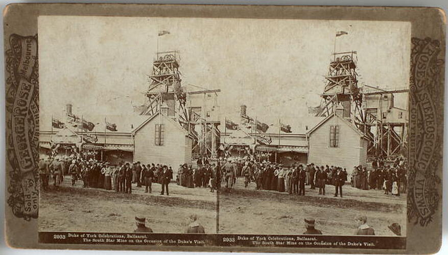 Text: 2933 Duke of York Celebrations, Ballaarat/ The South Star Mine on the Occasion of the Duke's Visit.; Sold only by/ GEORGE ROSE/ PUBLISHER/ Melbourne.; ROSE'S STEREOSCOPIC VIEWS/COPYRIGHT.