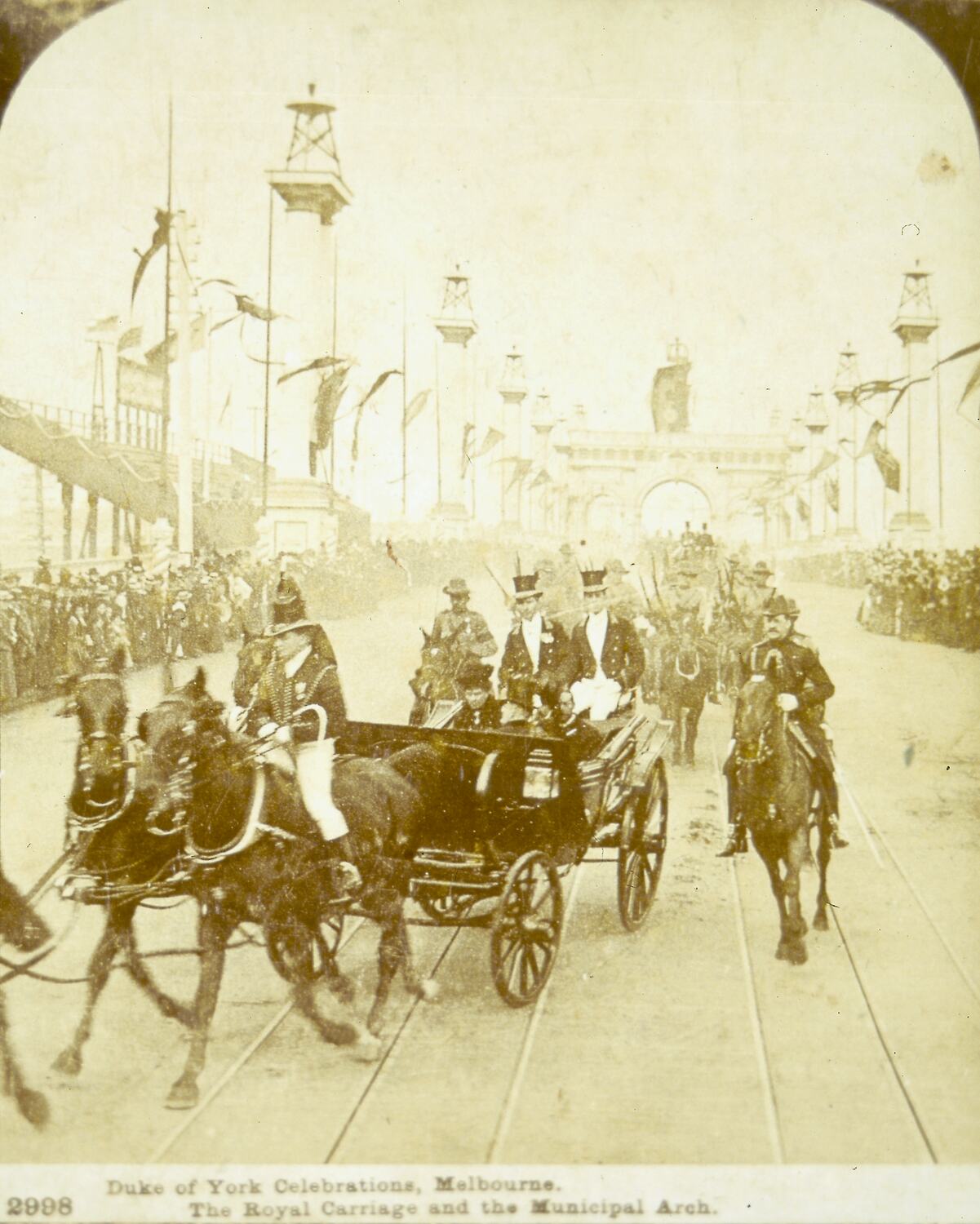 Text: 2998 Duke of York Celebrations, Melbourne./ The Royal Carriage and the Municipal Arch.; Sold only by/GEORGE ROSE/ PUBLISHER/Melbourne.; ROSE'S STEREOSCOPIC VIEWS/COPYRIGHT.