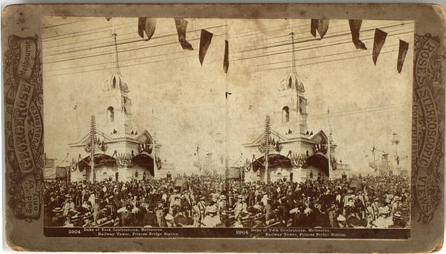 Text: 2904 Duke of York Celebrations, Melbourne/ Railway Tower, Princes Bridge Station; Sold only by/ GEORGE ROSE/ PUBLISHER/ Melbourne.; ROSE'S STEREOSCOPIC VIEWS/ COPYRIGHT.
