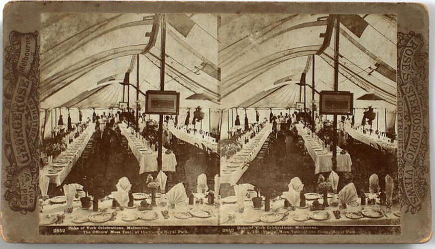 Text: 2852 Duke of York Celebrations, Melbourne/ The Officer's Mess Tent at the Camp, Royal Park; Sold only by/ GEORGE ROSE/ PUBLISHER/ Melbourne.; ROSE'S STEREOSCOPIC VIEWS/ COPYRIGHT.