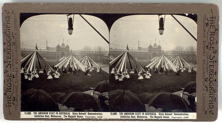Text: 12892 THE AMERICAN FLEET IN AUSTRALIA. State Schools' Demonstration,/Exhibition Oval, Melbourne. The Maypole Dance. COPYRIGHT, 1908. PUBLISHER/Melbourne. ROSE'S STEREOSCOPIC VIEWS/COPYRIGHT. SYDNEY, WELLINGTON & LONDON.