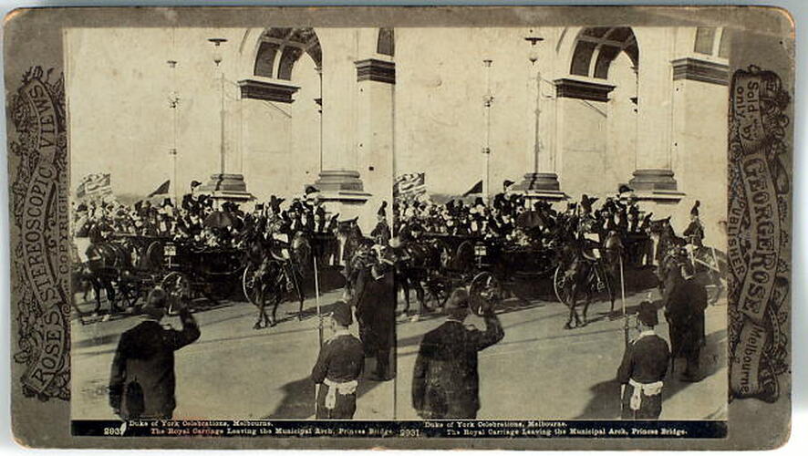 Text: 2831 Duke of York Celebrations, Melbourne./ The Royal Carriage Leaving the Municipal Arch, Princes Bridge.; ROSE'S STEREOSCOPIC VIEWS/ COPYRIGHT.; Sold only by/ GEORGE ROSE/ PUBLISHER/ Melbourne.
