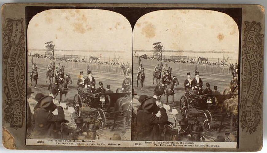 Text: 3014 Duke of York Celebrations, Melbourne./ The Duke and Duchess en route for Port Melbourne.; Sold only by/GEORGE ROSE/ PUBLISHER/Melbourne.; ROSE'S STEREOSCOPIC VIEWS/COPYRIGHT.