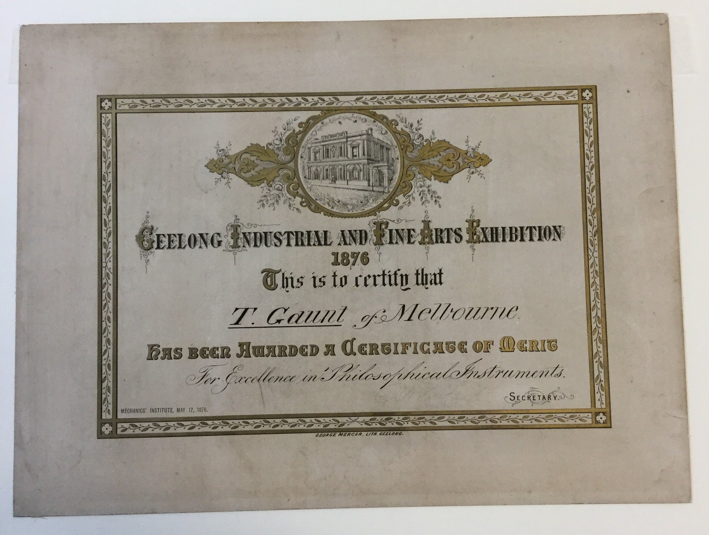 Text: GEELONG INDUSTRIAL AND FINE ARTS EXHIBITION/1876/This is to certify that/T Gaunt of Melbourne/HAS BEEN AWARDED A CERTIFICATE OF MERIT/ For Excellence in Philosophical Instruments/MECHANICS INSTITUTE, MAY 17, 1876/ SECRETARY.