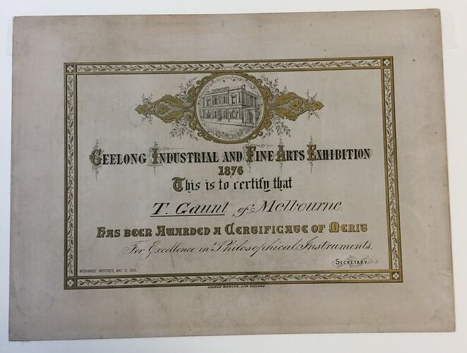 Cream coloured certificate with black & gold print in a heavy cream cardboard frame. At the top a depiction of the Geelong Mechanics Institute in a circular border and decorated with leaves and scrolls. Text of certificate says that Thomas Gaunt has been awarded a certificate of merit for excellence in Philosophical Instruments. Dated Mechanics Institute, May 17, 1876 and signed by Secretary. Decorative border around certificate of 2 lines, in gold, with a pattern of leaves between them. Lithograph by George Mercer, Geelong.