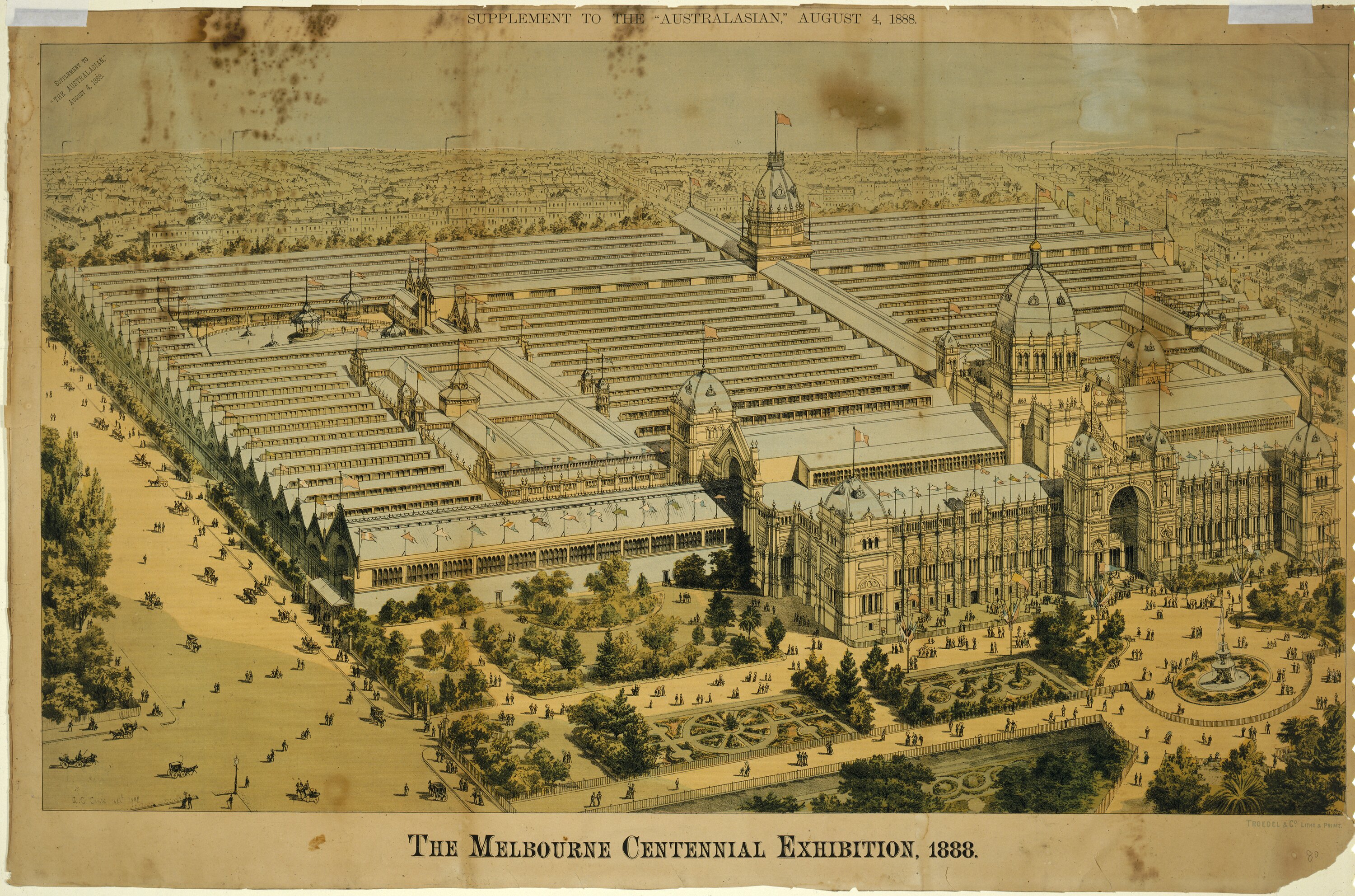 Printed in image, upper left corner: SUPPLEMENT TO/ "THE AUSTRALASIAN,"/ AUGUST 4, 1888. Printed below image: THE MELBOURNE CENTENNIAL INTERNATIONAL EXHIBITION, 1888. Printed below image, lower right: TROEDEL & CO. LITHO & PRINT.