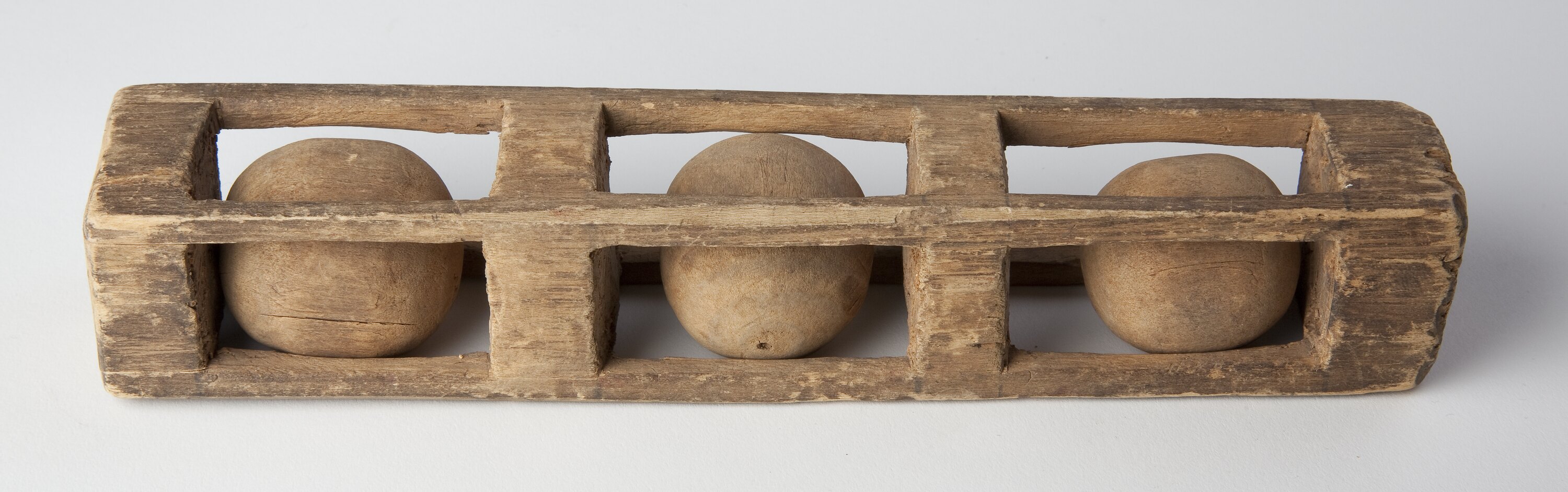 Wooden baby's rattle, hand carved from a single piece of linden wood. The wood is not varnished or stained. Rectangular in shape, with three hollow windows cut out from the wood. One carved wooden ball is encased in each of the three windows to form the rattle. The wood has a rough appearance.