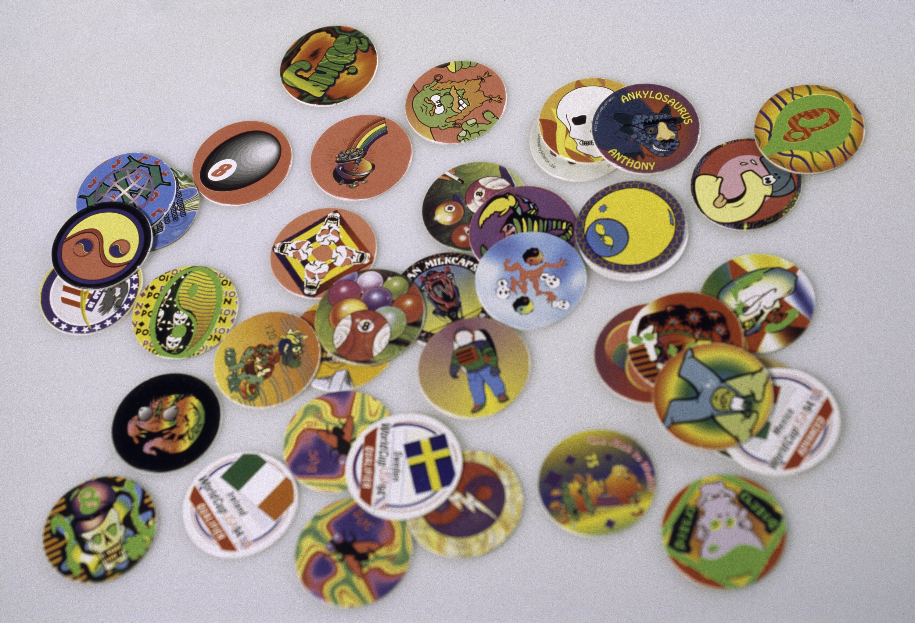 The game of POG was created in the early 1930s by children in Hawaii. They used the cardboard tops from flavoured drinks and made up a game with them. They called the game POG, after the flavours of the drink - Pineapple, Orange and Guava, and the playing pieces became Pogs. Around the mid-1990s, Pogs were used by the makers of toys, food and drink as a marketing tool directed at children. In Australia, the US snack food company Frito-Lay produced multiple series of Pogs with popular cartoon characters on them, and called them 'Tazos'. They became collectibles for adults as well as children. Australian children play the game, but they usually do not know these objects as Pogs, but as Tazos. These Pogs are examples of the kind available in the USA, and are not common in Australia, although similar patterns and types of images can be obtained here