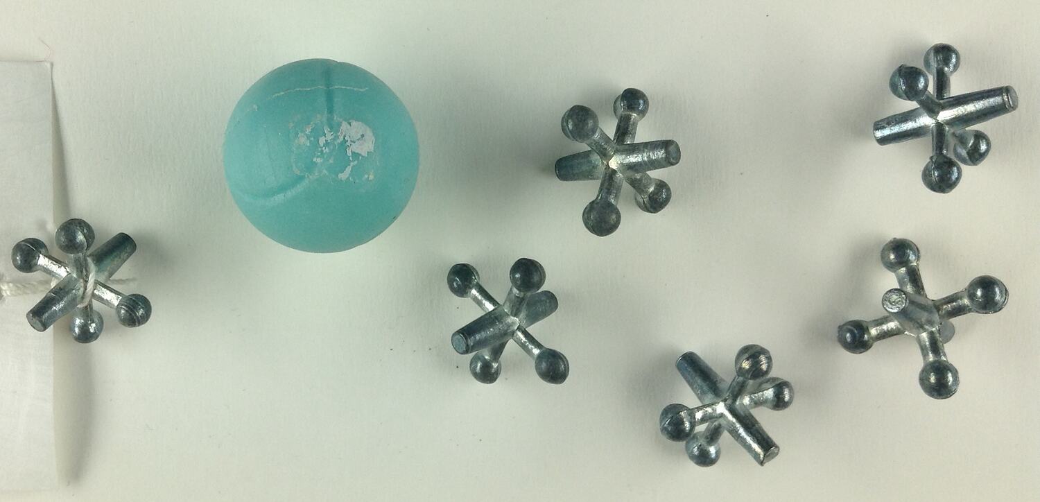 Set of six metal jacks with a small rubber ball, made in Taiwan, China. This is a typical form of jacks in the United States and the United Kingdom.
