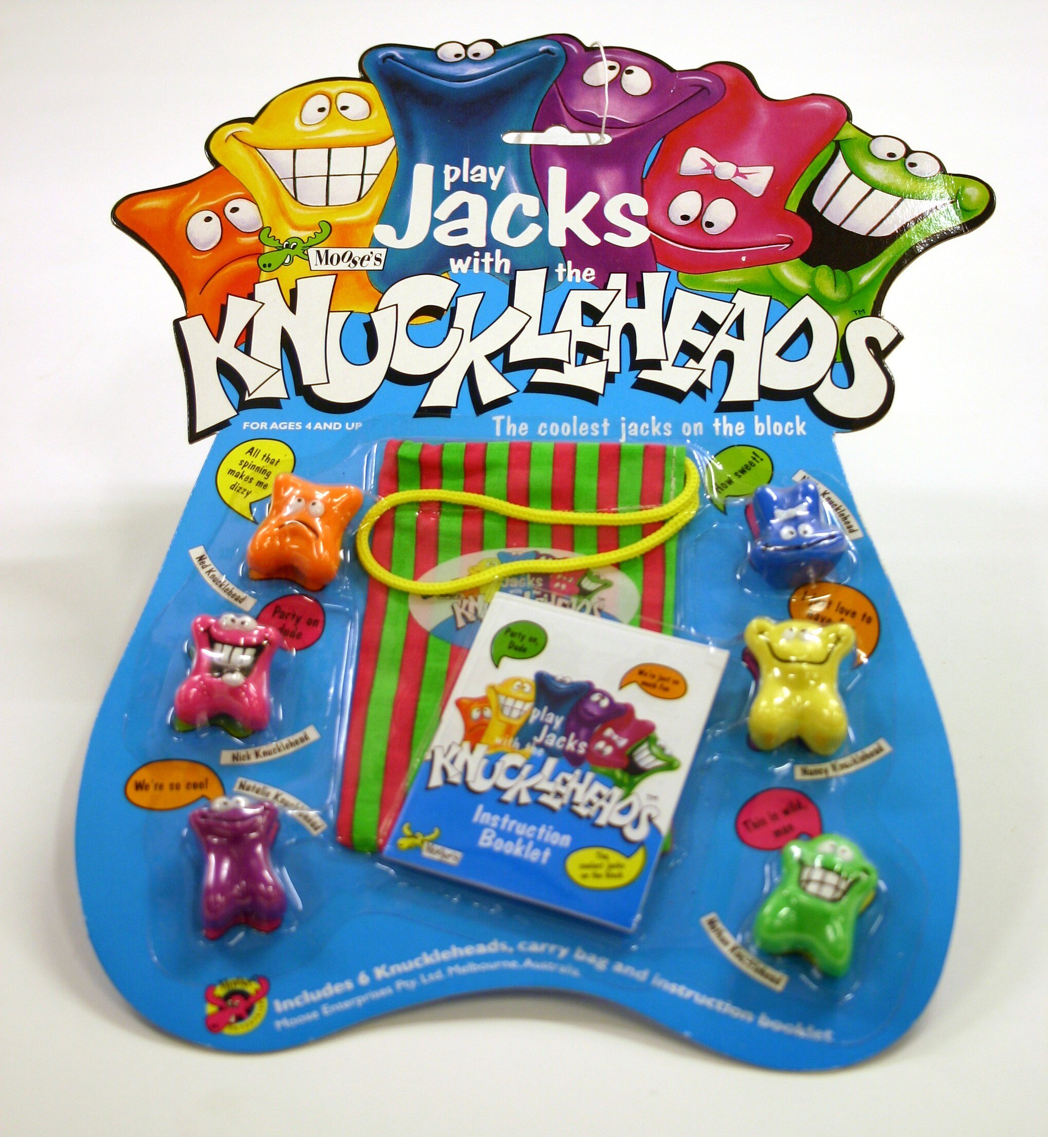 On backing sheet: Image of Knuckleheads with Play Jacks with the Knuckleheads overprinted, 'speech bubbles'; on back: cartoon illustrations of Knuckleheads, names of Moose's Jacks games, Customer information and Warning in several languages; on front: 'names' of the Knuckleheads, contents list - 6 Knuckleheads, carrying bag & instruction booklet.
