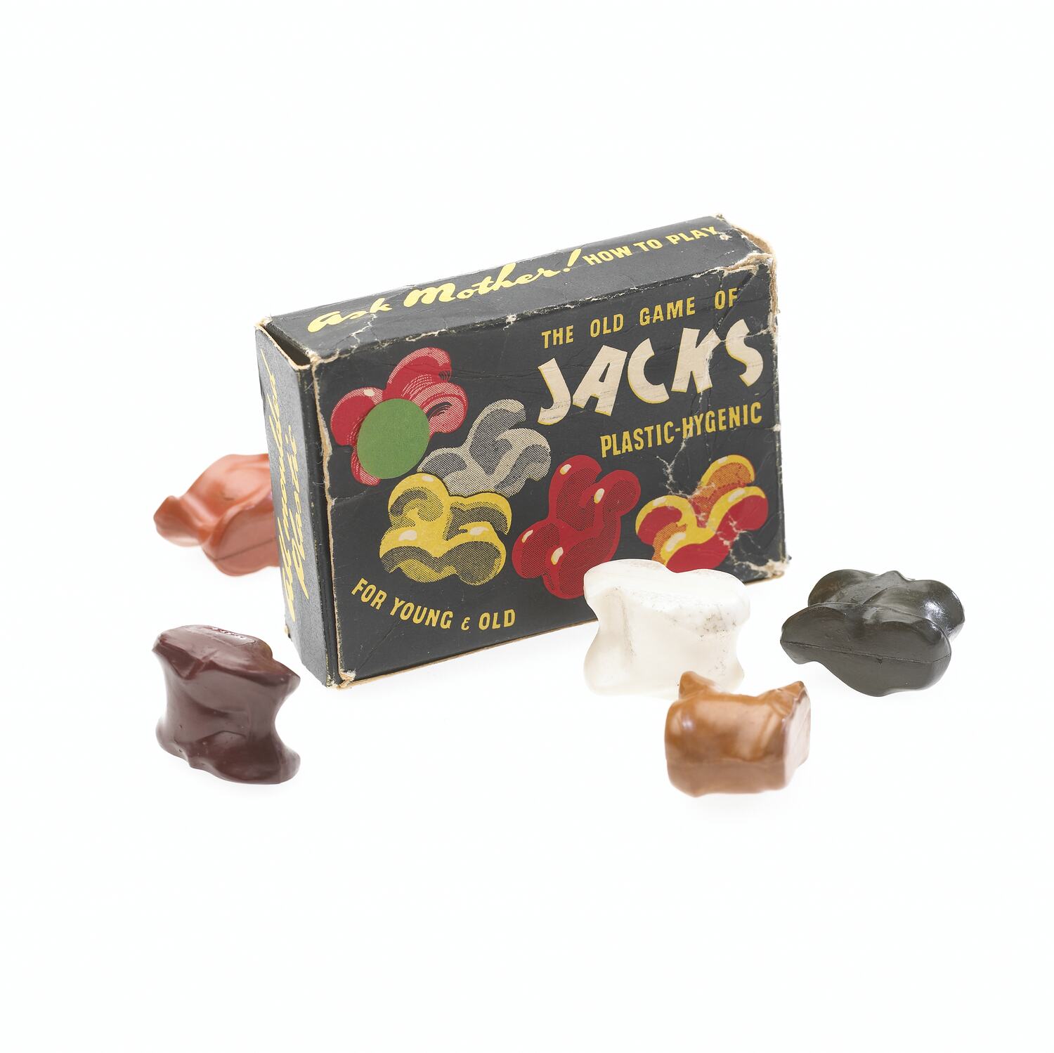 On front and back of box: 'The Old Game of JACKS, plastic-hygenic, for young and old'. On sides of box: 'Ask Mother! how to play'. On each end of box: 'All moulded Plastic'.