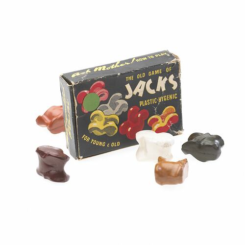 Knucklebones, or Jacks, is an ancient game, dating back to prehistoric times. The first jacks were natural materials - animal bones, stones, seeds and shells. Sheep's knucklebones were the most common type of jacks in Australia during the first half of this century, and children would colour them by boiling them in water with ink or dye. During the 1950s, mass-produced plastic knucklebones became available. These objects are examples of the very earliest type of mass-produced plastic replica knucklebones used by Australian children to play the game of Jacks. The size, shape and weight of real sheeps' knucklebones were replicated, in contrast to later versions which are much smaller and lighter.