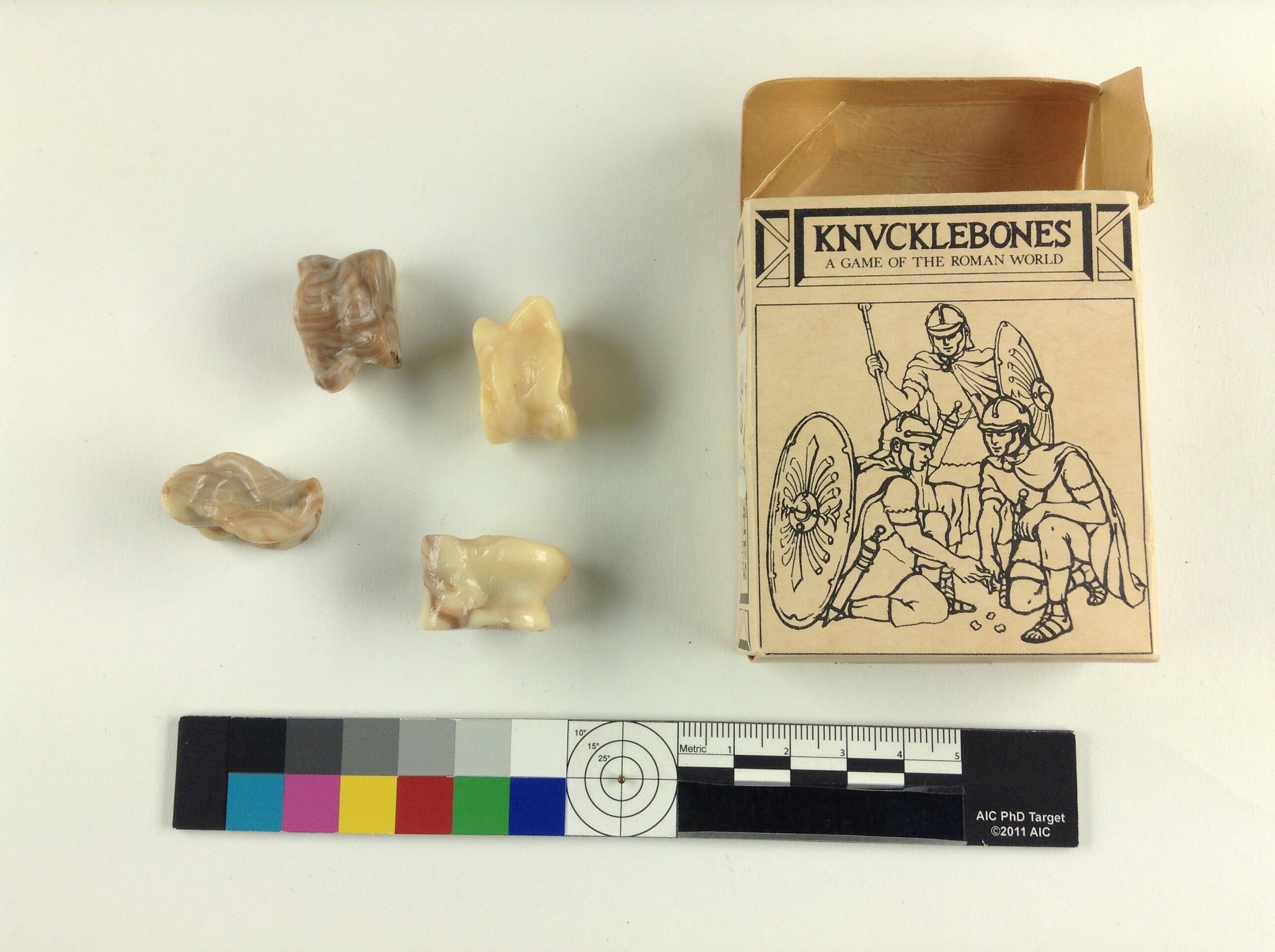 Four small plastic replica knucklebones in cardboard box. The knucklebones are marbled brown/bone - one is predominantly bone coloured. Each knucklebone has one of the numbers 1,3,6 and 4 moulded into each face. In the box is an A4 sheet, white with black printing on both sides, giving history and rules of the game. The box is made from off-white cardboard with black print. On front, illustration of Roman soldiers and printed text. On back, further historical notes and an introduction to the games. One side has a price sticker.