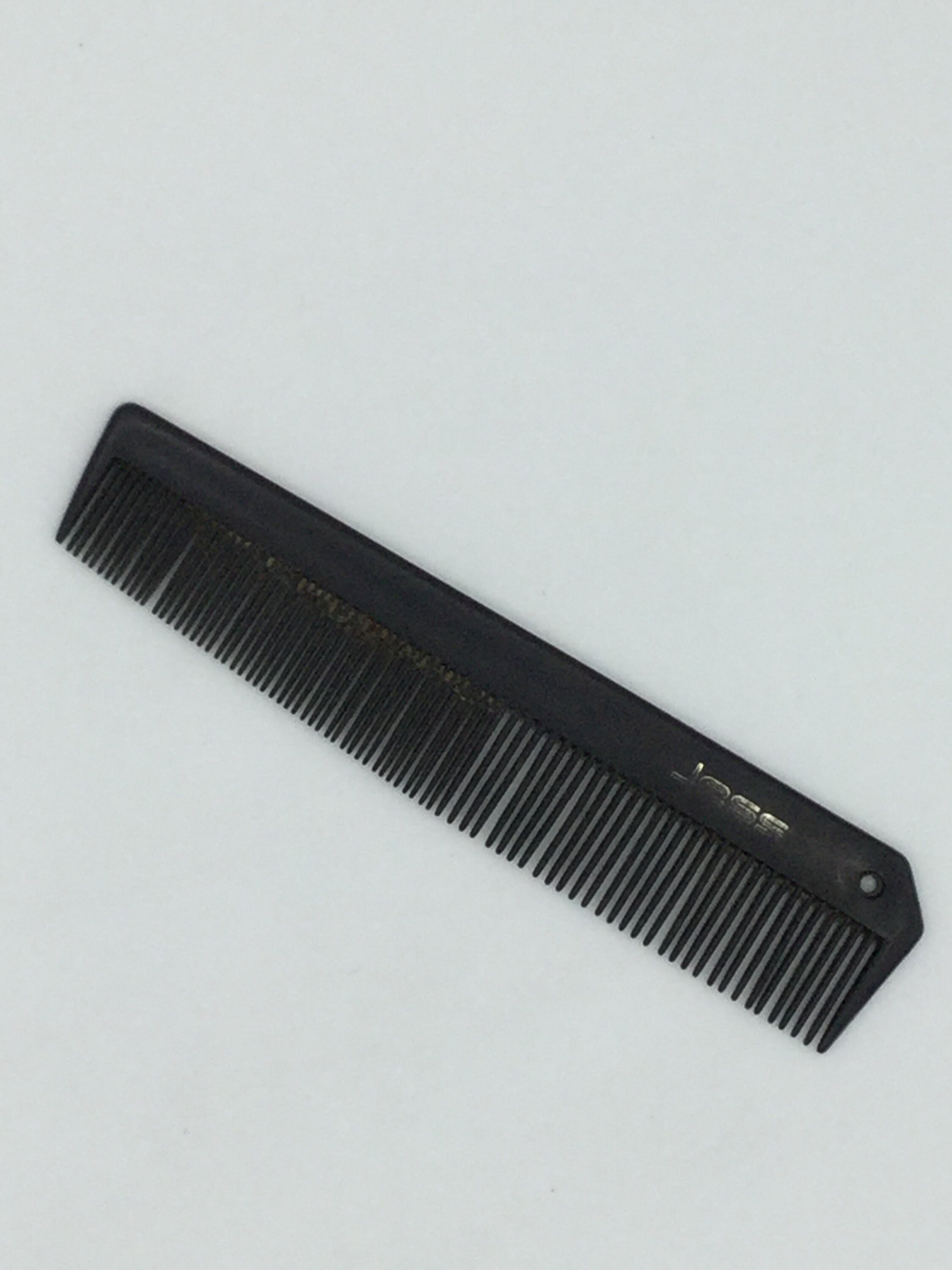 Small black hair comb belonging to Fredric Tolksdorf and contained in the pocket of a quilt (HT 57607) made by Julienne Tolksdorf (nee Precious) in 2003 at her home in Moonee Ponds in memory of her husband Fredric (Ferdinand on his passport) who died in 2001. The quilt has been made from shirts which had belonged to Fredric and also includes fabric-printed photographs of him and their son Christopher (who died in 2010). The pocket also contains Fredric's German passport (HT 57607.1) and a Deutschmark coin (NU 49823). The pocket has a silver Victorian Railways button taken from his work uniform.