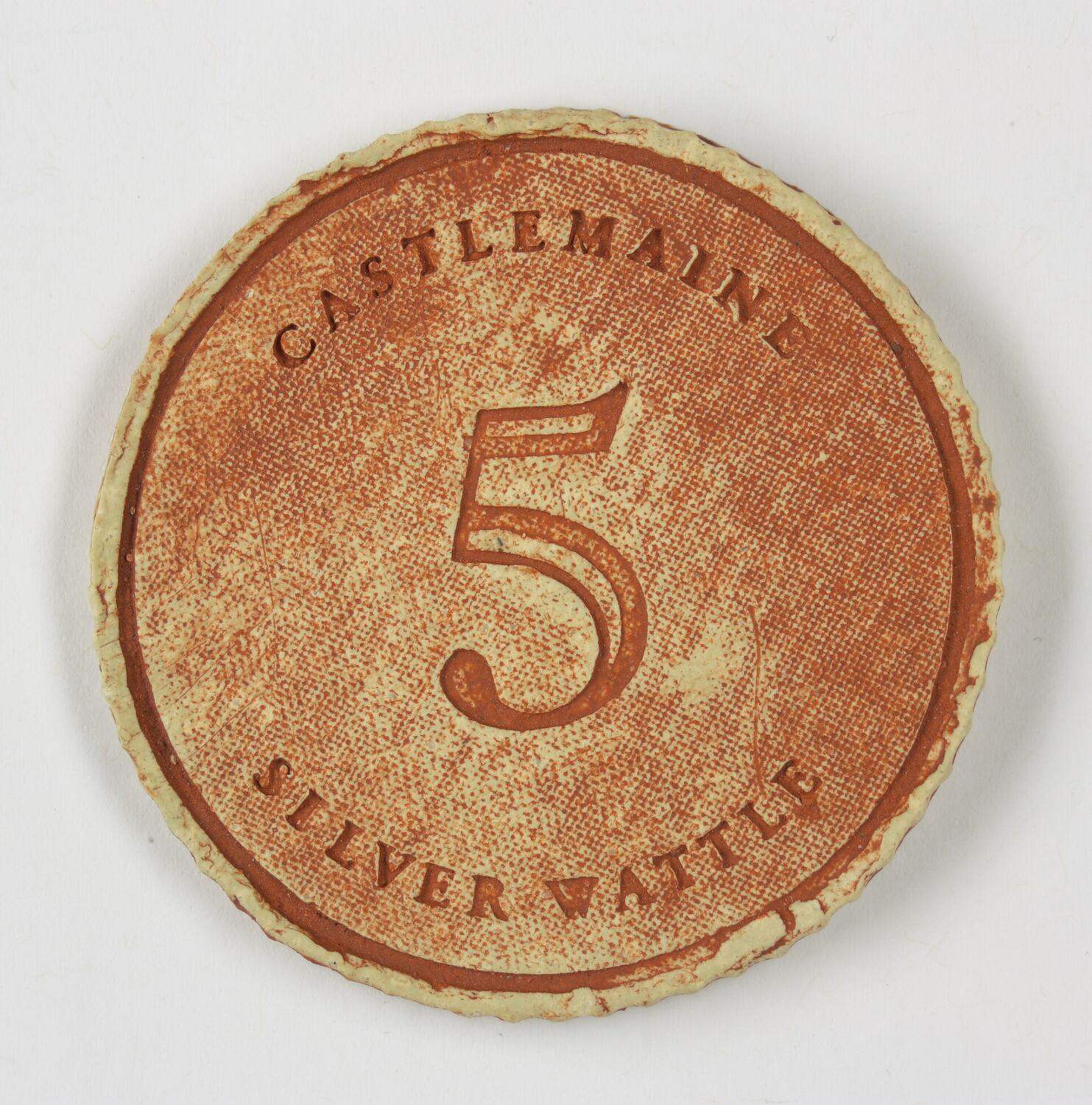 Handmade coin made of clay from the local area of Castlemaine. The obverse was imprinted with a piece of silver wattle foliage. It could be used purchase a wide range of products and services in the Castlemaine area. 5 Silver Wattle (5sw) in 2022 in was worth $50.00 AUD.