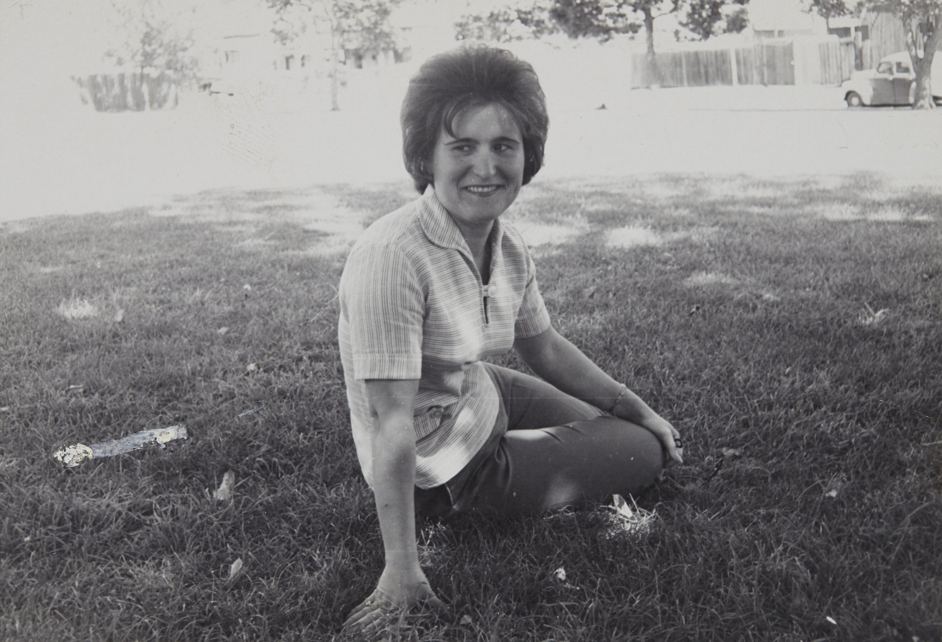 Black and white digital photograph of Evanthia Dimitrakopoulos sitting in a park in Melbourne soon after arriving in Australia in 1958.