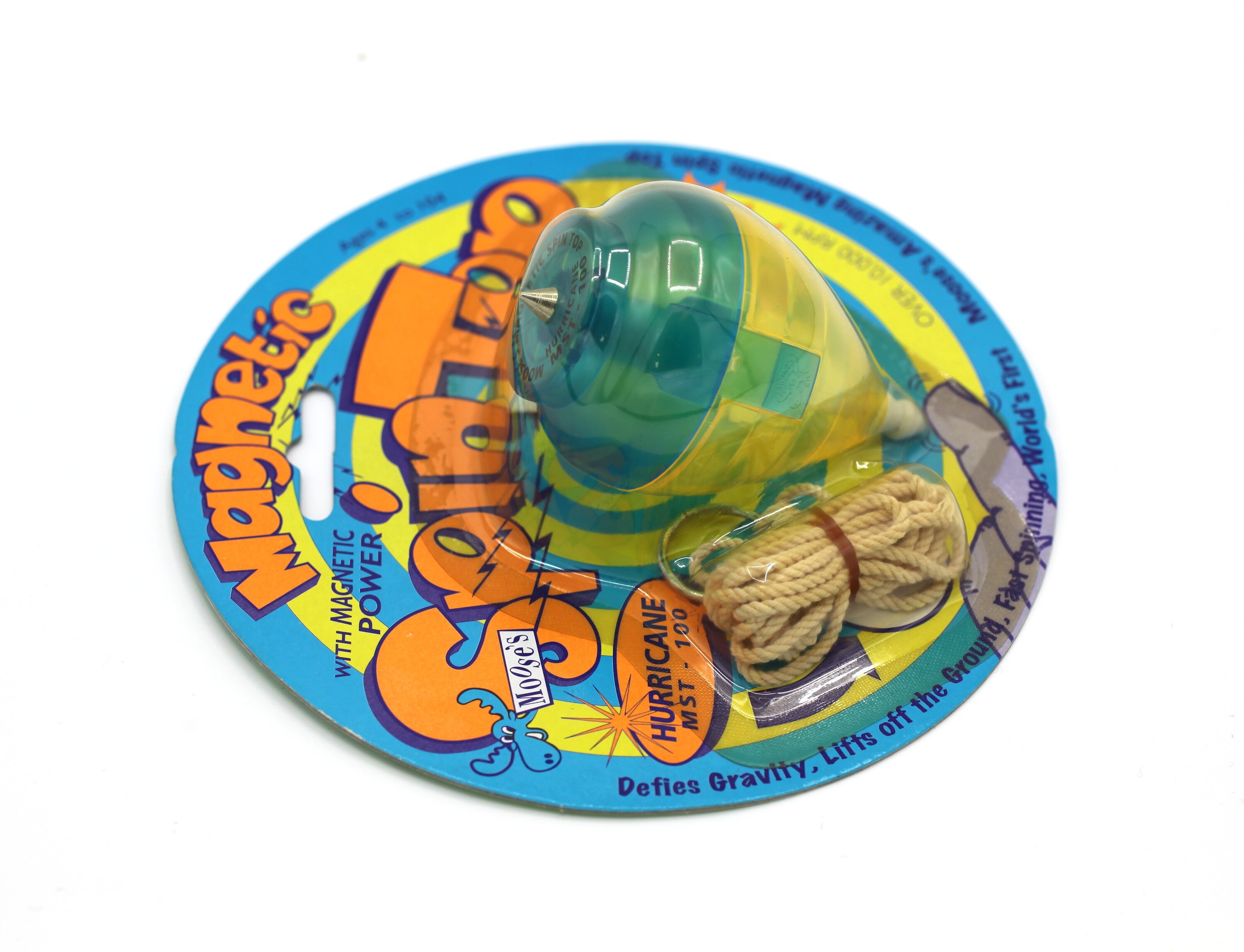 On cardboard backing: Magnetic Spin Top/Moose's/ HURRICANE MST - 100/OVER 10,000 RPM. On back of card: extensive text: Instructions, Magnetic/Spin Top./COOL! Manufacturer's details.