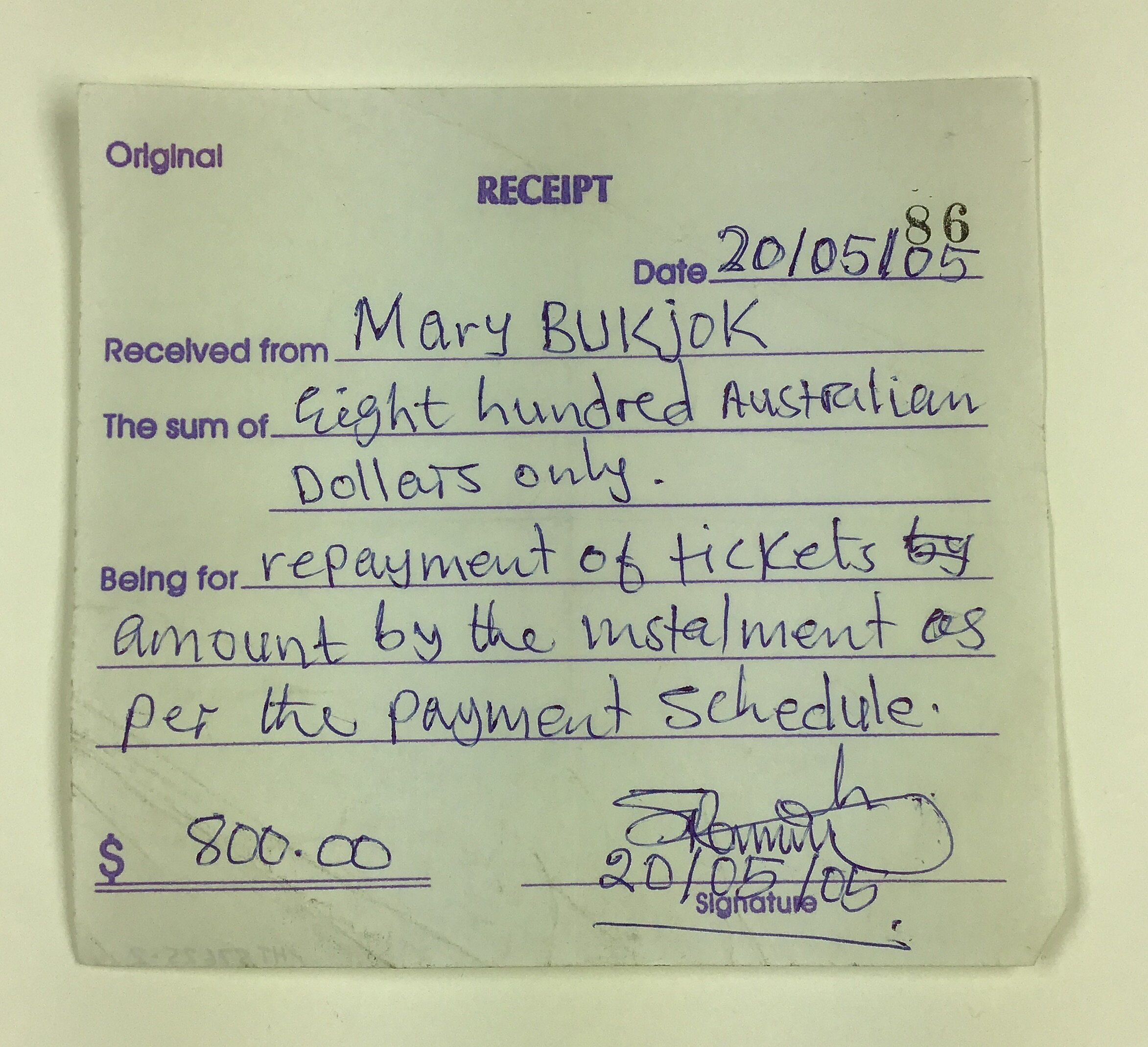 Receipt from the International Organisation for Migration (IOM) to Mary Jok Bukjiok for the amount of 15408.00 (Kenyan currency) for pre-travel medical costs for the Nyuon family, Nairobi, Kenya, 1 May 2004. Nyadol's family was sponsored to migrate through Australia's Family Reunion Scheme; an uncle in the United States loaned funds to pay for required medicals, and the airfare costs were loaned by a community member in Melbourne.