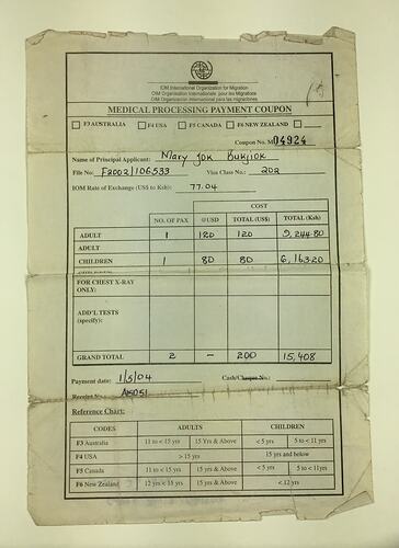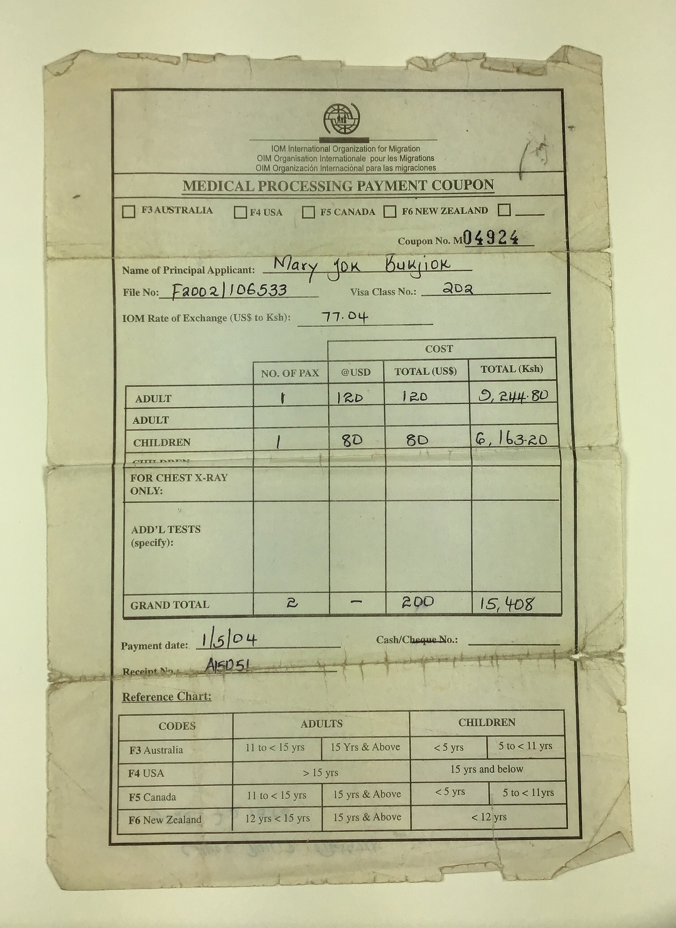 Medical processing payment coupon from the International Organisation for Migration (IOM) to Mary Gok Bukjiok with payment of 15,408.00 (Kenyan currency) due date 1 May 2004. Nyadol's family was sponsored to migrate through Australia's Family Reunion Scheme; an uncle in the United States loaned funds to pay for required medicals, and the airfare costs were loaned by a community member in Melbourne.
