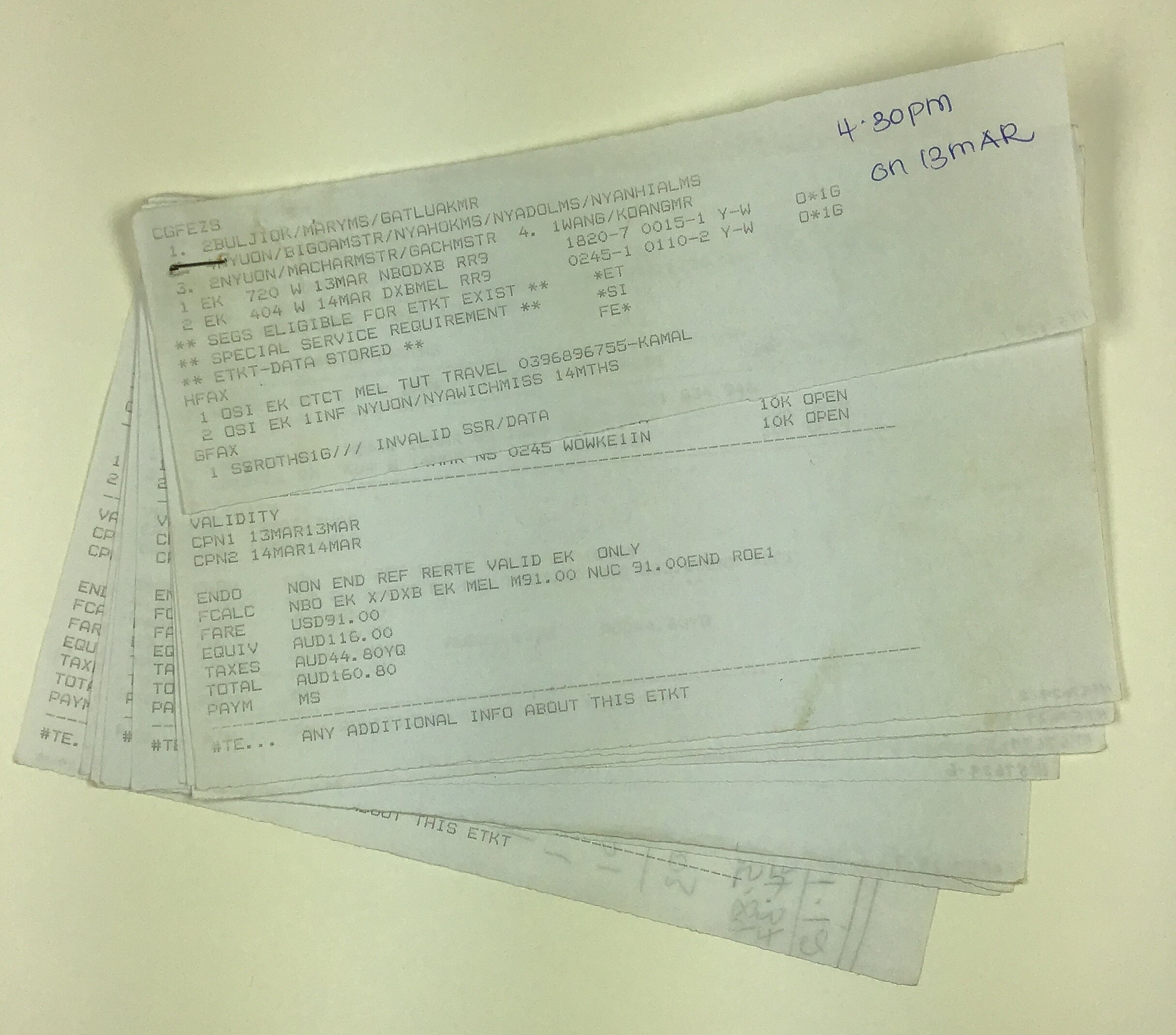 Nine Emirates flight ticket receipts and one summary sheet (stapled together) issued for 2 March 2005 for Emirates flight dated 13 March 2005 from Nairobi to Melbourne. Nyadol's family was sponsored to migrate through Australia's Family Reunion Scheme; an uncle in the United States loaned funds to pay for required medicals, and the airfare costs were loaned by a community member in Melbourne.