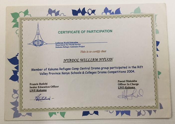 Certificate of Participation to Nyadol William Nyuon, member of the Kakuma Refugee Camp Central Drama group, 2004. The group participated in the Rift Valley Province Kenya Schools and Colleges Drama Competitions.