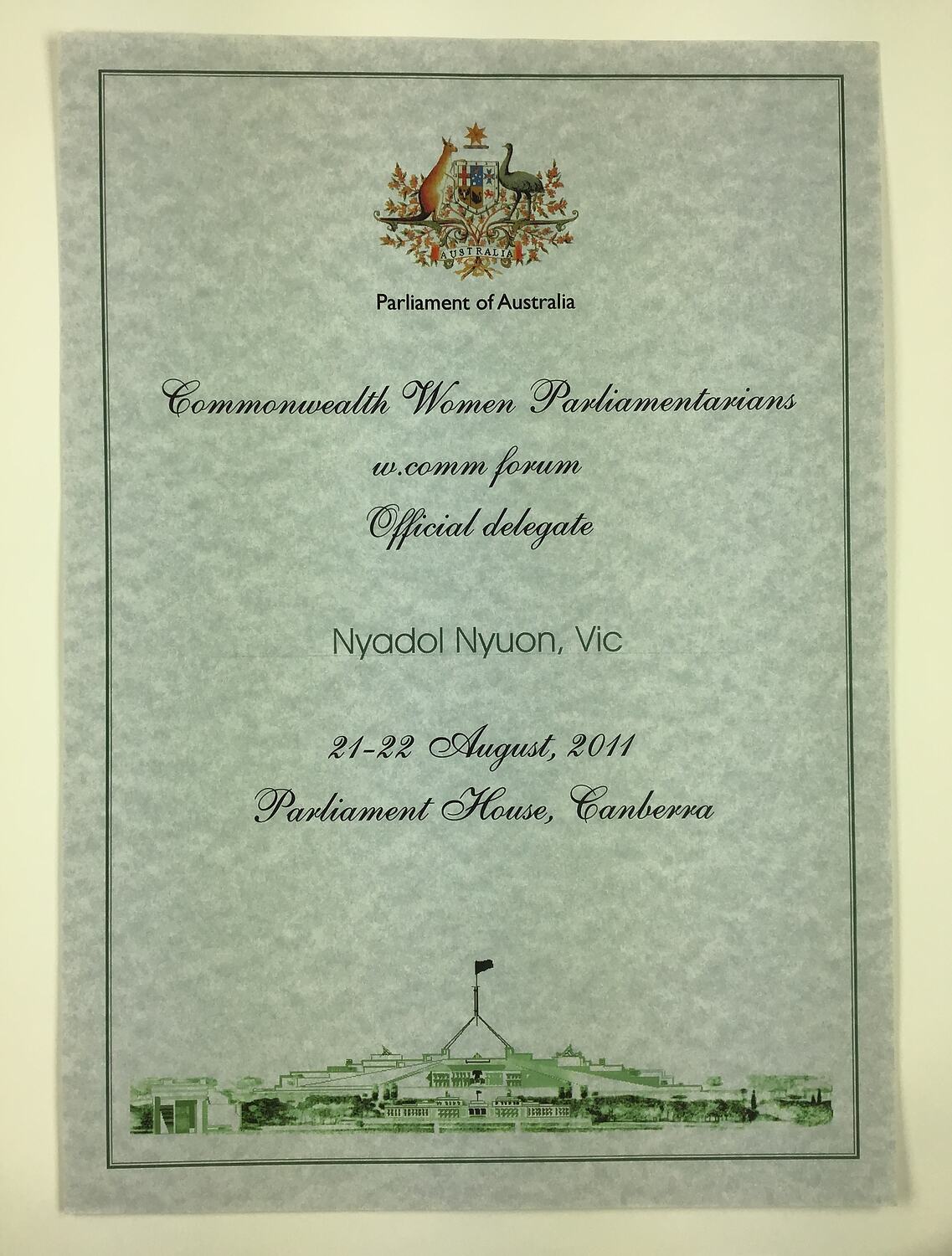 Certificate awarded to Nyadol Nyuon for being a Delegate to the Commonwealth Women Parliamentarians Forum, Parliament of Australia, Parliament House Canberra, 21-22 August 2011.