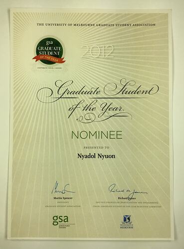 Certificate awarded to Graduate Student of the Year Nominee, Nyadol Nyuon, University of Melbourne Graduate Student Association, 2012.
